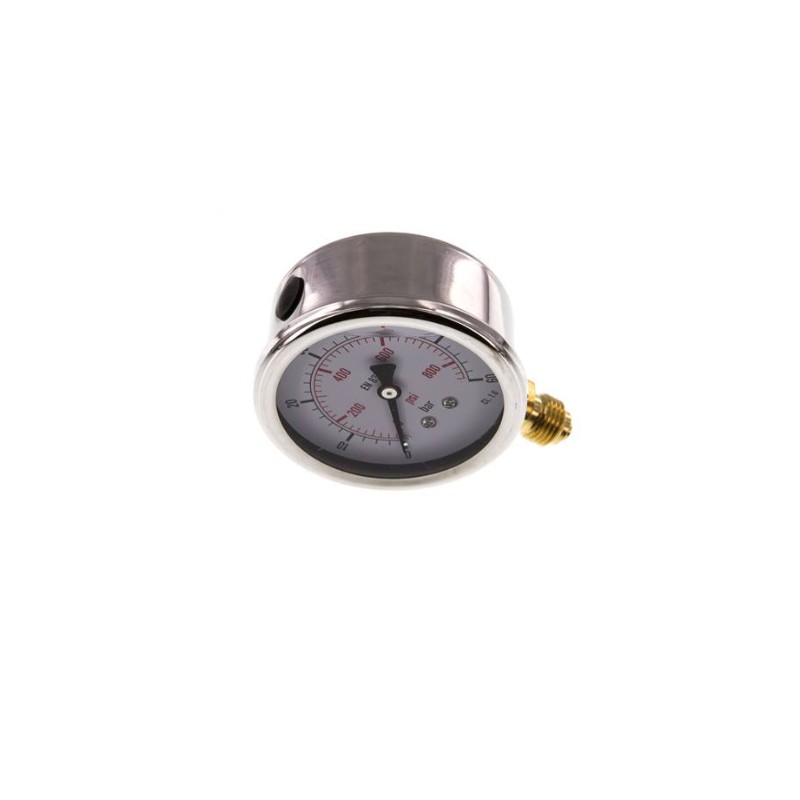 Nyomásmérő óra glicerin csillapítással, átmérő 63 mm, kijelzési nyomástartomány 0 bar ... 400 bar, csatlakozás alsó G1/4, működési hőmérséklet tartomány: -20°C ... 60°C. Ház: 1.4301 rozsdamentes acél, mérőrendszer és csatlakozás: Cu-ötvözet, ablak: polikarbonát. Védettség: IP65.