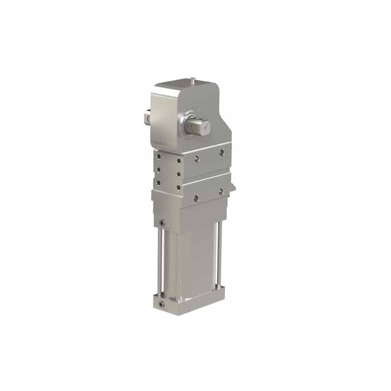 Destaco pneumatikus erőszorító, miniatűr kivitel, ø 25-ös munkahengerrel, M5 pneumatikus csatlakozással. Nyitási szög 105°, tartási nyomaték (max.) 80 Nm.