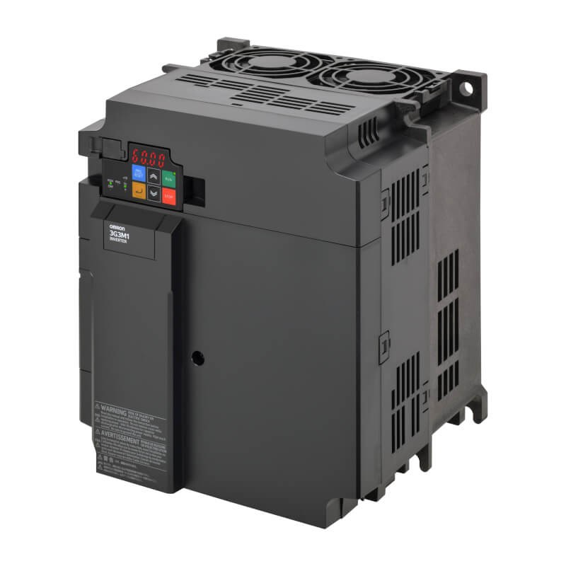 Omron M1 AC Drive, 3.0/4.0 kW (HD/ND), 7.2/8.8 A (HD/ND), 400 VAC, 3~ bemenet, OLV/CLV vezérlés, STO, max. kimenő frekvencia 590 Hz.