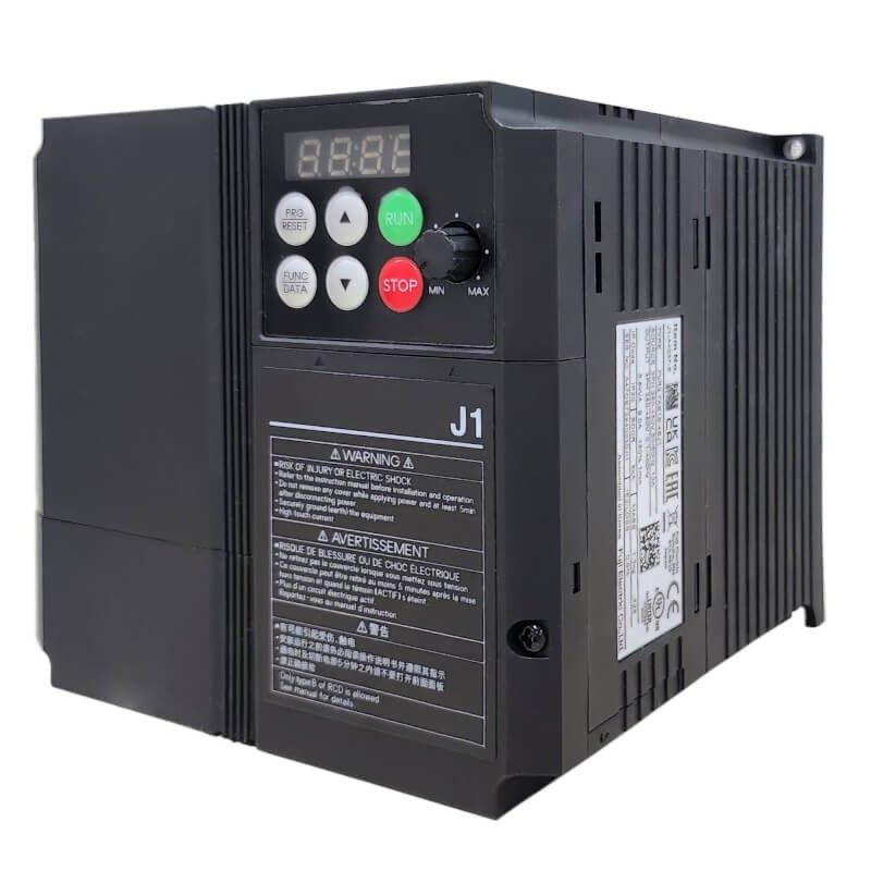 Omron J1 sorozatú 3,7 kW névleges teljesítményű általános célú frekvenciaváltó 10,5 A névleges áramú aszinkron motorhoz. Táplálás: 3 fázis 400 V, 50/60 Hz. Maximális kimenő frekvencia: 400 Hz.