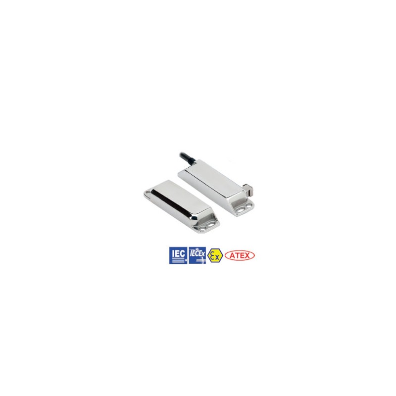 Omron érintésmentes reed-relés robbanásbiztos ajtókapcsoló, rozsdamentes acél tokozás, 2db NC és 1db NO kontaktus, 5m beöntött kábellel.