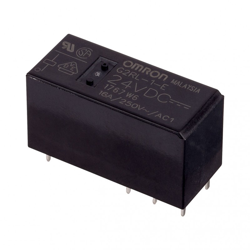 Omron G2RL sorozatú áramköri lapra beültethető relé, SPDT érintkezővel, 24 V DC tekercsfeszültséggel, 250 V AC/12 A kapcsolási kapacitással, 4 kV szigetelési feszültséggel.