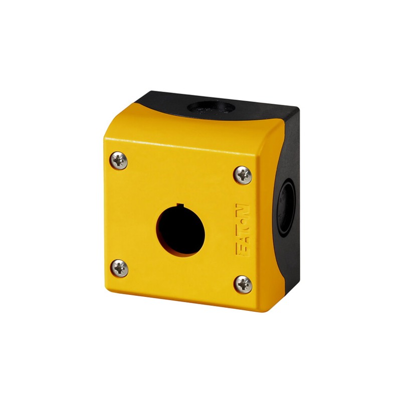 Eaton sárga üres tokozat (vészgombhoz), 1 db 22 mm-es furattal, M20-as tömszelence menettel. Gyártói cikkszám: 216536.