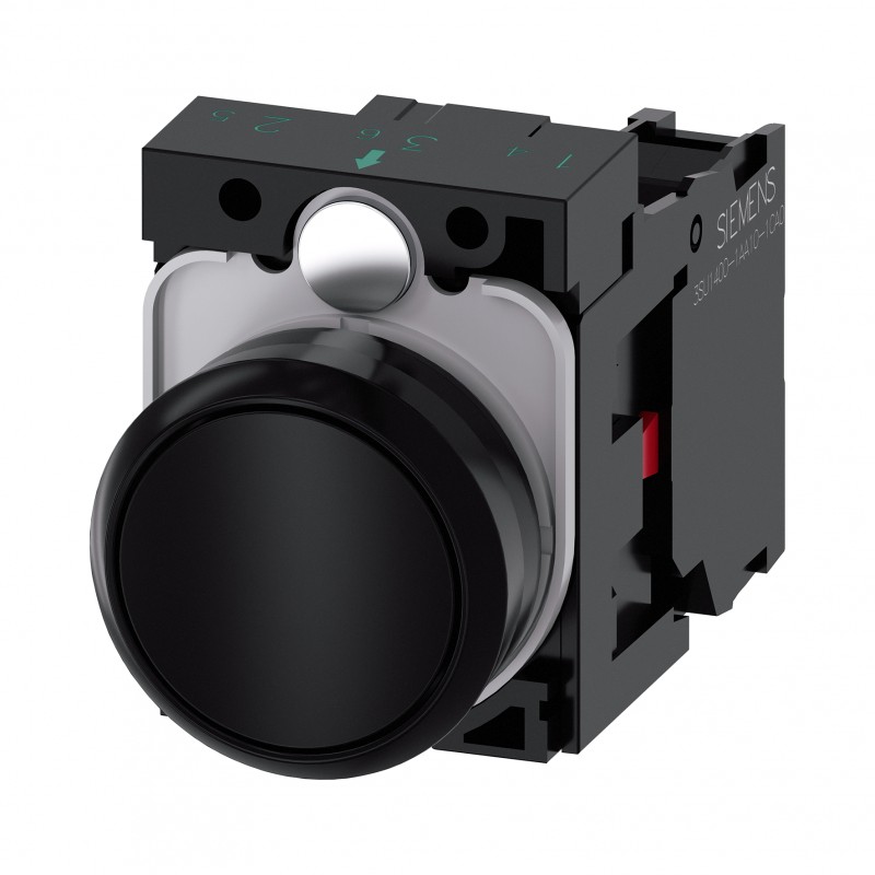 Siemens nyomógomb, 22 mm, kerek, műanyag, fekete, lapos, pillanatnyi érintkező típusú, 1 NC tartóval, csavaros kapocs.