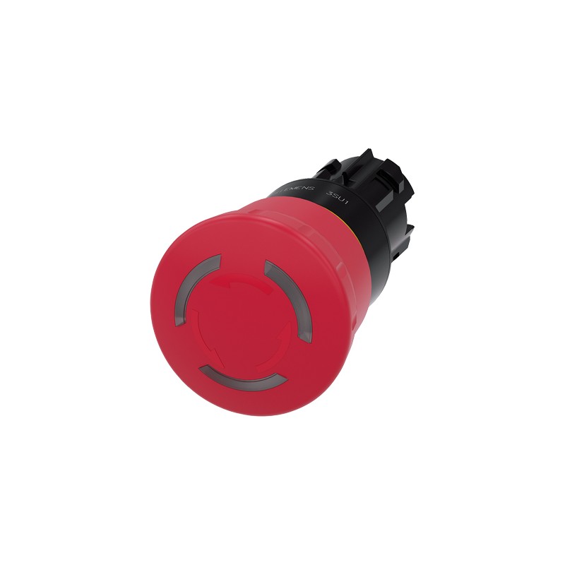 Siemens Sirius gombafejű vészgomb, világítós, 22 mm-es furatba, kerek, műanyag, piros, 40 mm-s fej, kioldás forgatással.