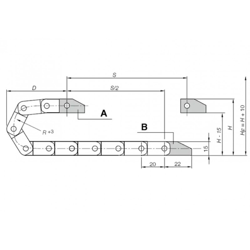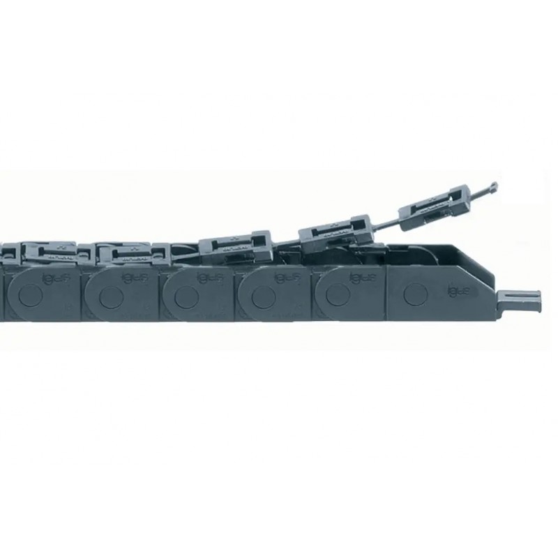 igus Energialánc 07 sorozat, cipzárral nyitható a külső sugár mentén, belső magasság: 10,3 mm, (egy szem = 20 mm / 50 szem = 1 m). Max. kábelátmérő 8 mm, hajlítási rádiusz 18 mm, szem szélessége: 12,5 mm (külső) / 6 mm (belső). Gyári cikkszám: 07.30.028.0