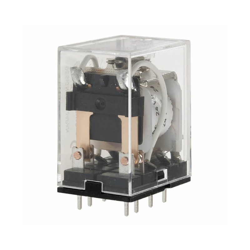 Nyomtatott áramköri relé 2 váltóérintkezővel. Működtetőfeszültség: 24 V DC. Érintkezők maximális terhelhetősége: 10 A / 250 VAC, 10 A / 30 VDC.