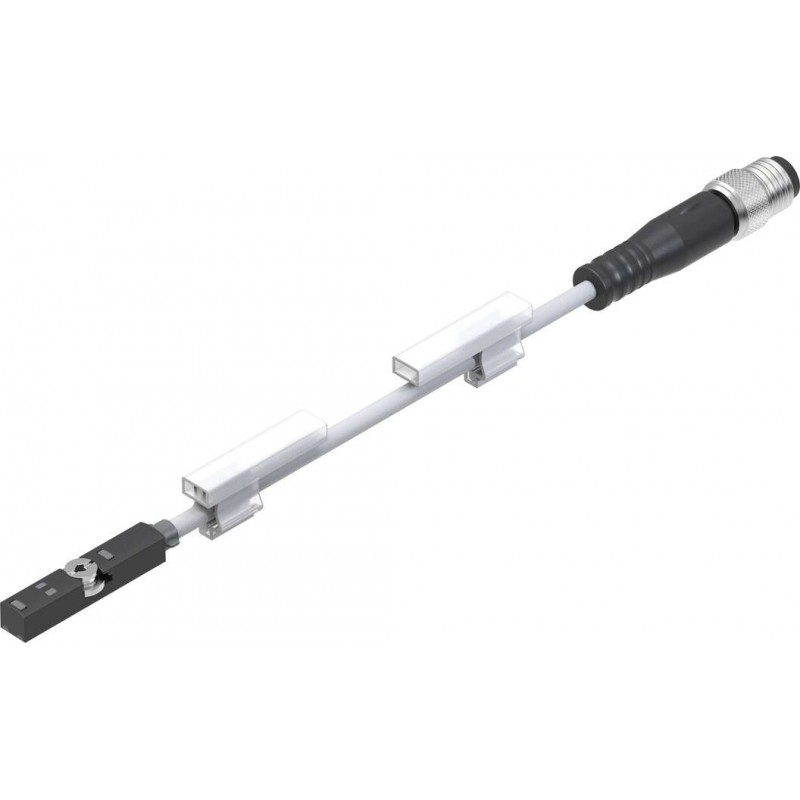 Festo SME sorozatú reed érzékelő, T-horonyba illeszthető. 2-vezetékes NO kimenet, 5-30 VAC/DC tápfeszültség. Olajálló kivitel, kábel hossza 2,5 m, szabad érvéggel, állapotjelző LED-del.