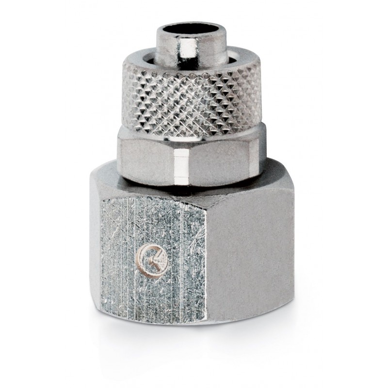 Camozzi nikkelezett réz egyenes gyorscsavarkötés G3/8 belső menettel 6/4 mm átmérőjű műanyag csövekhez.