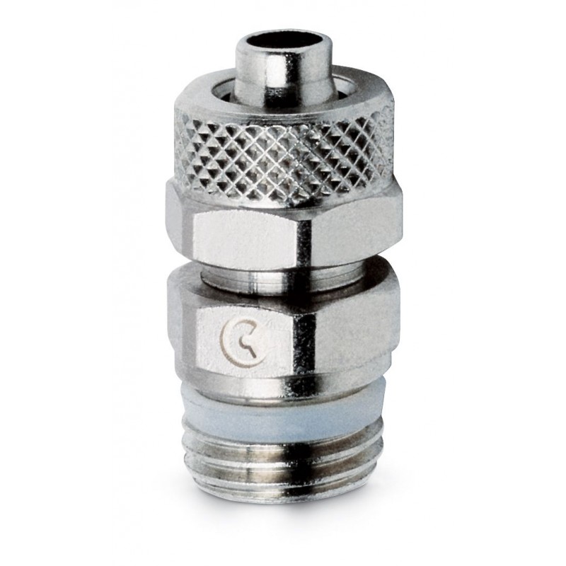 Camozzi nikkelezett réz egyenes gyorscsavarkötés G1/4 külső menettel 8/6 mm átmérőjű műanyag csövekhez.