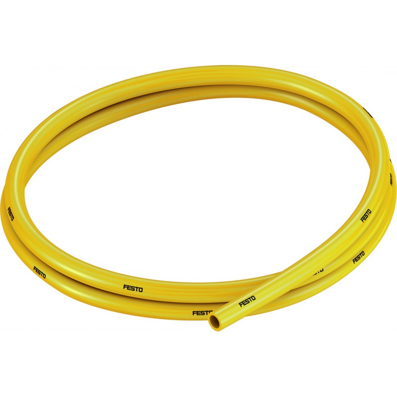Festo PUN-H műanyag cső, külső átmérő 4 mm, belső átmérő 2,6 mm, sárga. Minimum hajlítási rádiusz 8 mm, hőmérsékletfüggő üzemi nyomás: -0,95...10 bar, környezeti hőmérséklet -35°C...60°C. Anyag: hőre lágyuló poliuretán.