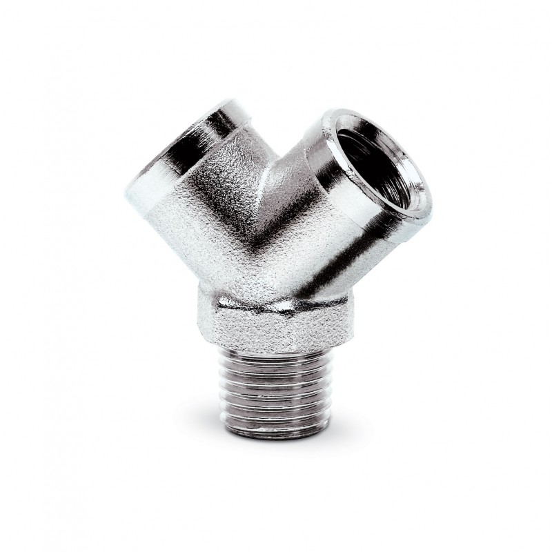Camozzi nikkelezett réz Y-csavarzat R1/8 külső és 2 x G1/8 belső menetes csatlakozással.