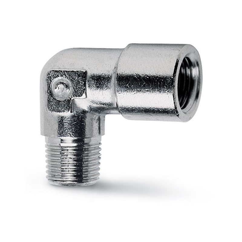Camozzi nikkelezett réz könyök csatlakozó R3/8 külső és G3/8 belső menetes csatlakozással.