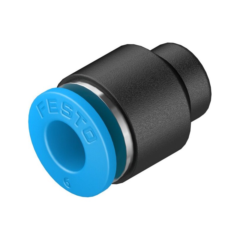 Festo QS sorozatú egyenes csatlakozó, 6 mm-es betolható hüvellyel (QS csatlakozóba) és push-in csatlakozóval 4 mm külső átmérőjű csövekhez.