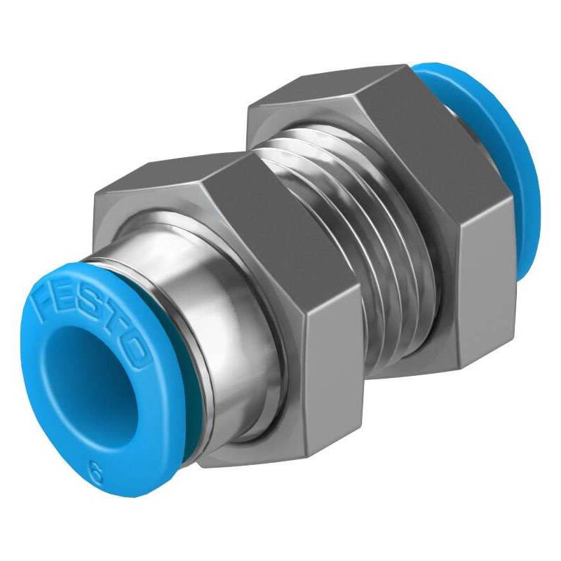 Festo QS sorozatú egyenes átvezető csatlakozó, mindkét végén push-in csatlakozóval 6 mm külső átmérőjű csövekhez.
