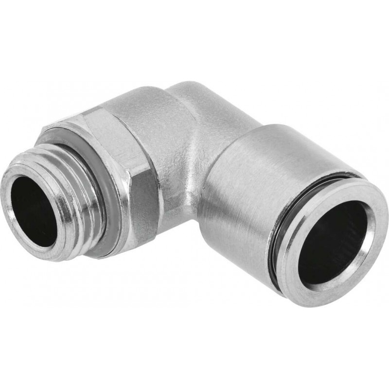 Festo QS sorozatú könyök csatlakozó, 10 mm-es betolható hüvellyel (QS csatlakozóba) és push-in csatlakozóval 10 mm külső átmérőjű csövekhez.