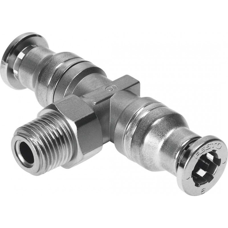 Festo CRQS sorozatú dugaszolható T-csavarzat, erősen ötvözött rozsdamentes acél, középen R1/2 külső menettel, két végén push-in csatlakozóval 16 mm külső átmérőjű csövekhez.