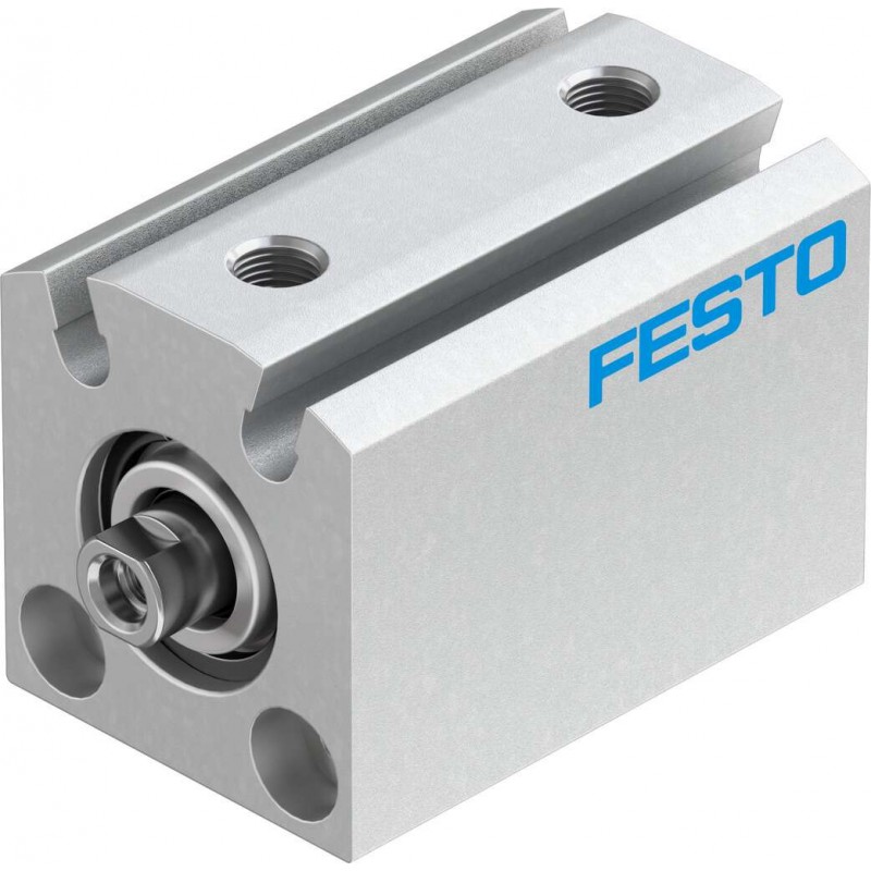Festo ADVC sorozatú kettősműködésű rövidlöketű henger, dugattyú átmérő 12 mm, lökethossz 5 mm. Rugalmas csillapító gyűrűkkel mindkét végén, üzemi nyomás 1 bar ... 10 bar, pneumatikus csatlakozás M5.