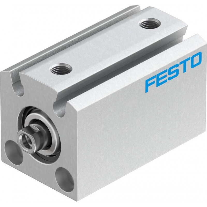 Festo ADVC sorozatú kettősműködésű rövidlöketű henger, dugattyú átmérő 12 mm, lökethossz 10 mm. Rugalmas csillapító gyűrűkkel mindkét végén, üzemi nyomás 1 bar ... 10 bar, pneumatikus csatlakozás M5.