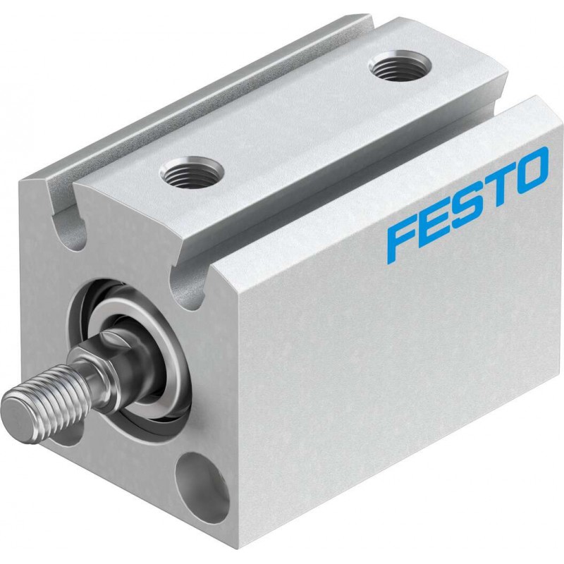 Festo ADVC sorozatú kettősműködésű rövidlöketű henger, dugattyú átmérő 12 mm, lökethossz 5 mm. Rugalmas csillapító gyűrűkkel mindkét végén, üzemi nyomás 1 bar ... 10 bar, pneumatikus csatlakozás M5.