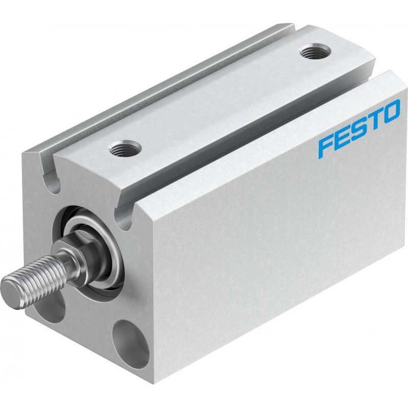Festo ADVC sorozatú kettősműködésű rövidlöketű henger, dugattyú átmérő 16 mm, lökethossz 25 mm. Rugalmas csillapító gyűrűkkel mindkét végén, üzemi nyomás 1 bar ... 10 bar, pneumatikus csatlakozás M5.