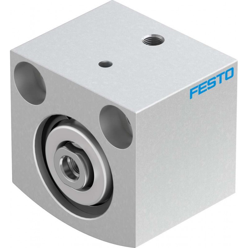 Festo AEVC sorozatú egyszeres működtetésű (nyomó) rövidlöketű henger, dugattyú átmérő 25 mm, lökethossz 10 mm. Rugalmas csillapító gyűrűkkel mindkét végén, üzemi nyomás 1.5 bar ... 10 bar, pneumatikus csatlakozás M5.