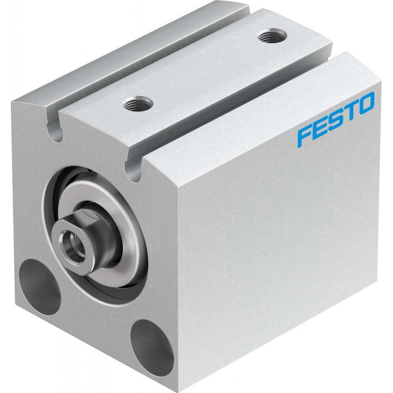 Festo ADVC sorozatú kettősműködésű rövidlöketű henger, dugattyú átmérő 25 mm, lökethossz 15 mm. Rugalmas csillapító gyűrűkkel mindkét végén, üzemi nyomás 1 bar ... 10 bar, pneumatikus csatlakozás M5.