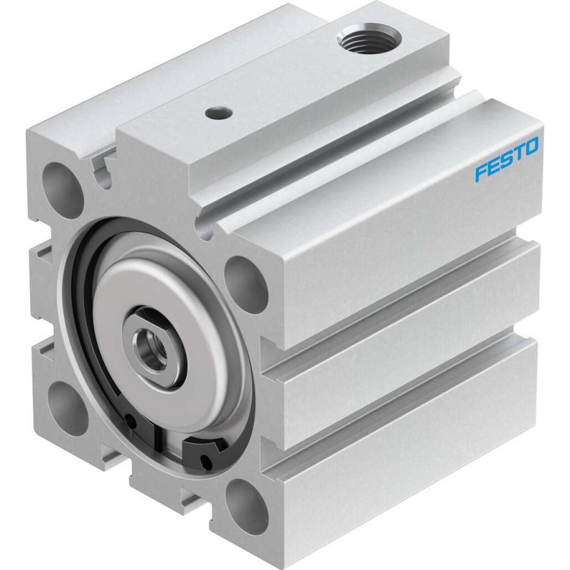 Festo AEVC sorozatú egyszeres működtetésű (nyomó) rövidlöketű henger, dugattyú átmérő 40 mm, lökethossz 25 mm. Rugalmas csillapító gyűrűkkel mindkét végén, üzemi nyomás 1 bar ... 10 bar, pneumatikus csatlakozás G1/8.
