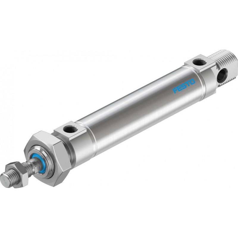 Festo DSNU sorozatú kör keresztmetszetű kettősműködésű szabványos henger, átmérő 25 mm, lökethossz 70 mm. Dugattyúrúd menet M10x1.25, pneumatikus csatlakozás G1/8, működési nyomástartomány: 1 bar ... 10 bar. Löketvégi csillapítás: önbeálló.
