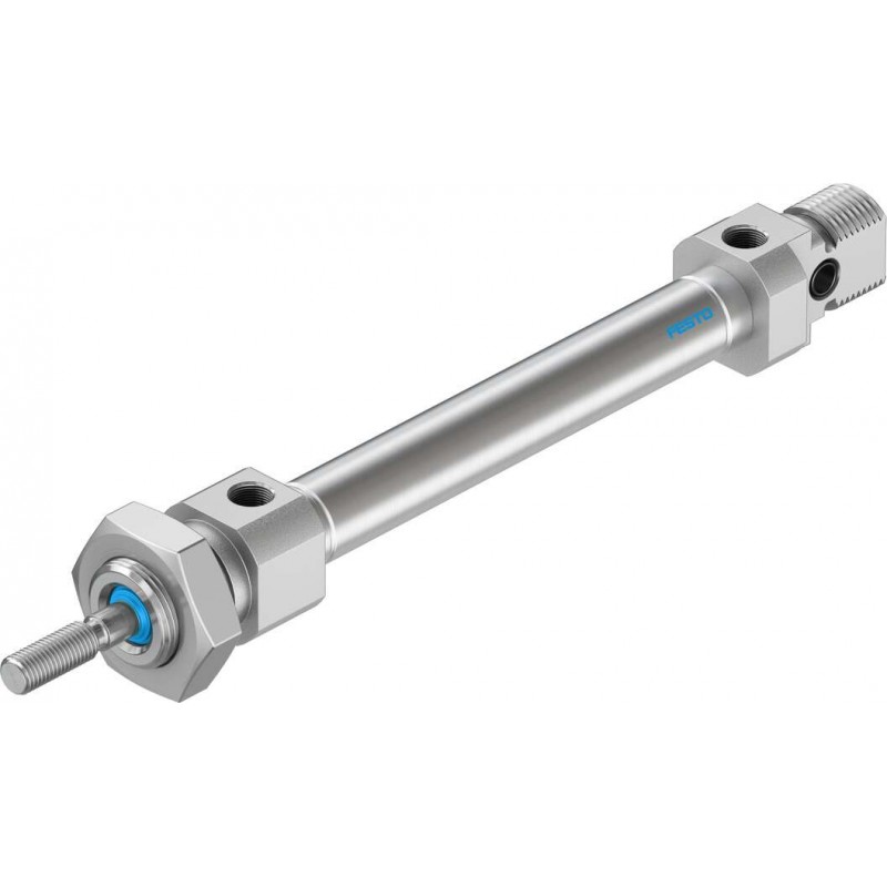Festo DSNU sorozatú kör keresztmetszetű kettősműködésű szabványos henger, átmérő 8 mm, lökethossz 40 mm. Dugattyúrúd menet M4, pneumatikus csatlakozás M5, működési nyomástartomány: 1.5 bar ... 10 bar. Löketvégi csillapítás: rugalmas csillapító gyűrűvel.