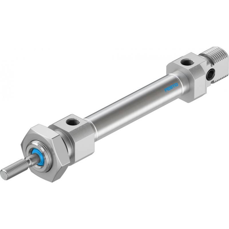 Festo DSNU sorozatú kör keresztmetszetű kettősműködésű szabványos henger, átmérő 8 mm, lökethossz 25 mm. Dugattyúrúd menet M4, pneumatikus csatlakozás M5, működési nyomástartomány: 1.5 bar ... 10 bar. Löketvégi csillapítás: rugalmas csillapító gyűrűvel.