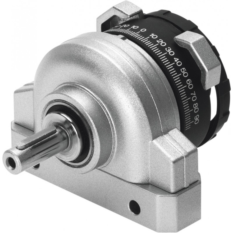 Festo DRRD sorozatú kettősműködésű fordító hajtómű, forgási szög 180°, pneumatikus csatlakozás G1/8, üzemi nyomás 3 bar ... 8 bar. Elméleti nyomaték 6 bar-on: 10,1 Nm.