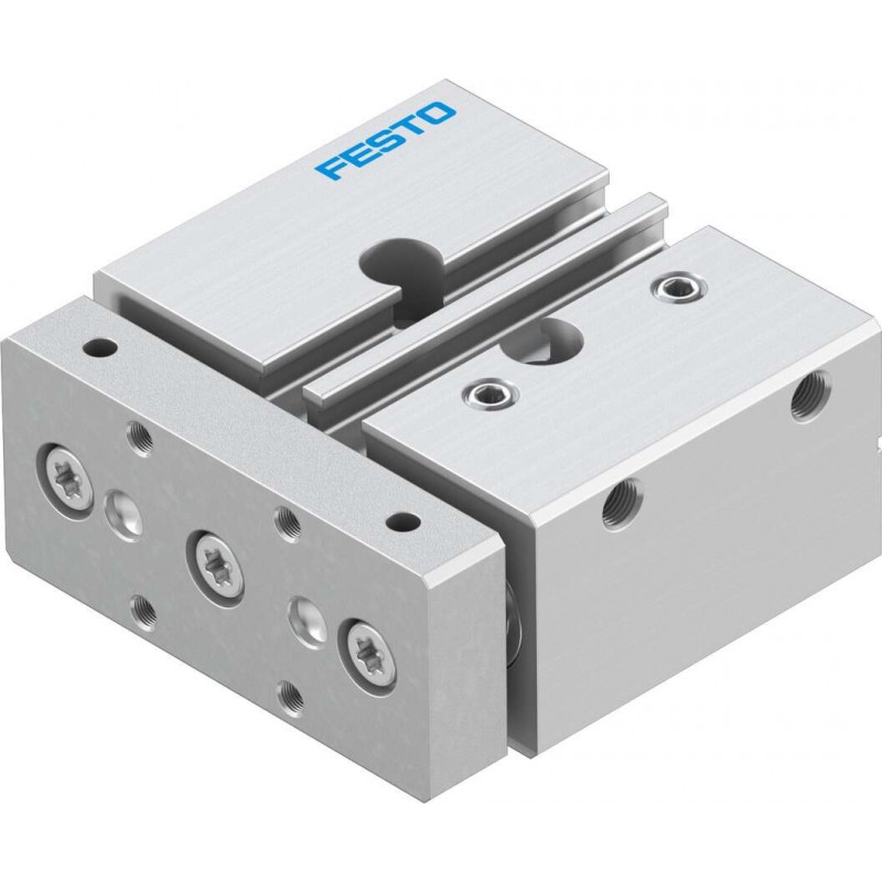 Festo DFM sorozatú kettősműködésű vezetett henger siklócsapággyal, dugattyú átmérő 40 mm, lökethossz 25 mm. Rugalmas csillapító gyűrűkkel mindkét végén, üzemi nyomás 1.5 bar ... 10 bar, pneumatikus csatlakozás G1/8.