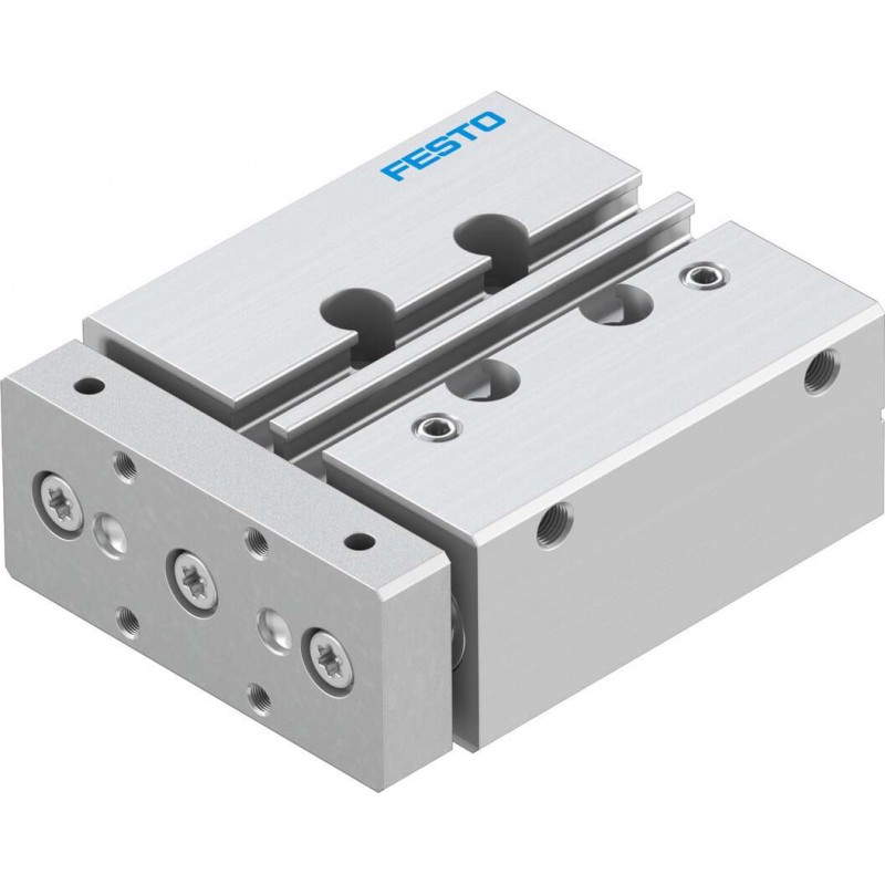 Festo DFM sorozatú kettősműködésű vezetett henger siklócsapággyal, dugattyú átmérő 40 mm, lökethossz 25 mm. Rugalmas csillapító gyűrűkkel mindkét végén, üzemi nyomás 1.5 bar ... 10 bar, pneumatikus csatlakozás G1/8.