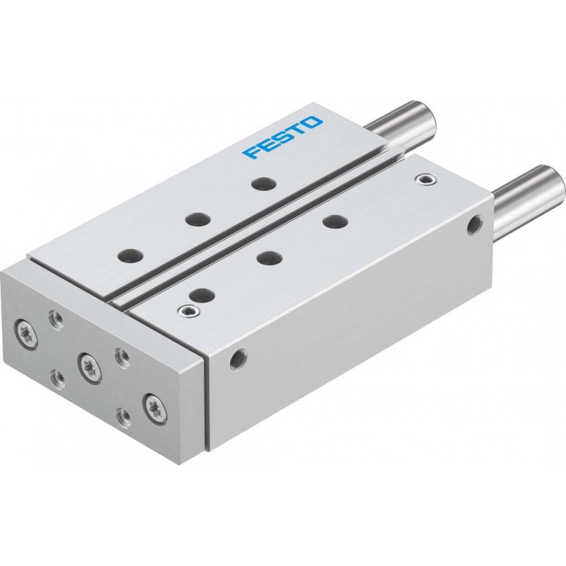 Festo DFM sorozatú kettősműködésű vezetett henger siklócsapággyal, dugattyú átmérő 50 mm, lökethossz 50 mm. Rugalmas csillapító gyűrűkkel mindkét végén, üzemi nyomás 1 bar ... 10 bar, pneumatikus csatlakozás G1/4.