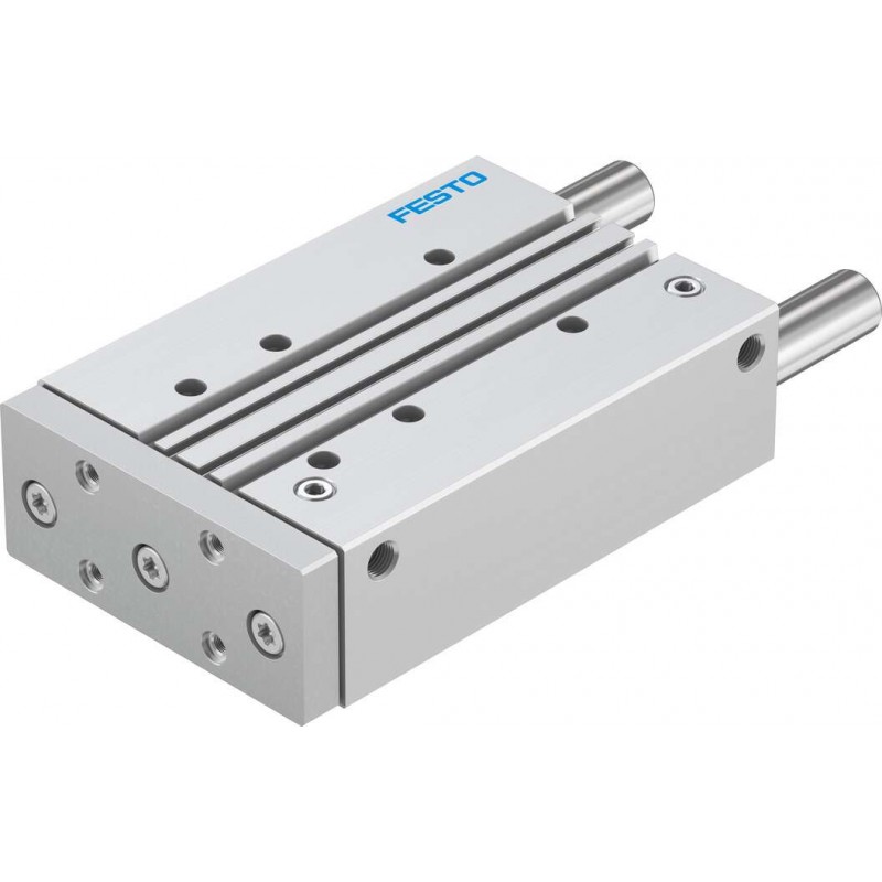 Festo DFM sorozatú kettősműködésű vezetett henger siklócsapággyal, dugattyú átmérő 50 mm, lökethossz 50 mm. Rugalmas csillapító gyűrűkkel mindkét végén, üzemi nyomás 1 bar ... 10 bar, pneumatikus csatlakozás G1/4.