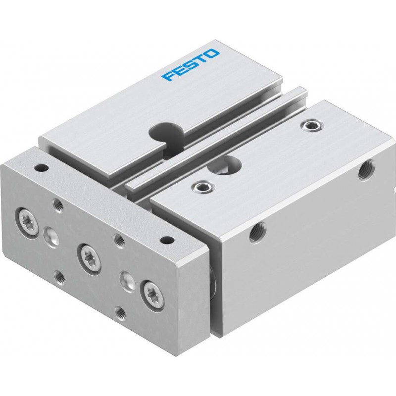 Festo DFM sorozatú kettősműködésű vezetett henger siklócsapággyal, dugattyú átmérő 40 mm, lökethossz 25 mm. Rugalmas csillapító gyűrűkkel mindkét végén, üzemi nyomás 1.5 bar ... 10 bar, pneumatikus csatlakozás G1/8.