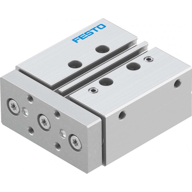 Festo DFM sorozatú kettősműködésű vezetett henger gördülőcsapággyal, dugattyú átmérő 12 mm, lökethossz 20 mm. Rugalmas csillapító gyűrűkkel mindkét végén, üzemi nyomás 2 bar ... 10 bar, pneumatikus csatlakozás M5.