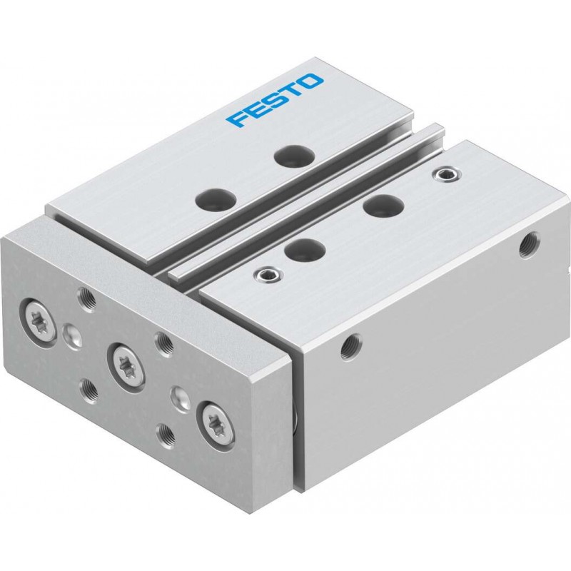 Festo DFM sorozatú kettősműködésű vezetett henger siklócsapággyal, dugattyú átmérő 40 mm, lökethossz 25 mm. Rugalmas csillapító gyűrűkkel mindkét végén, üzemi nyomás 1.5 bar ... 10 bar, pneumatikus csatlakozás G1/8.