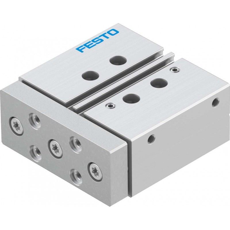 Festo DFM sorozatú kettősműködésű vezetett henger siklócsapággyal, dugattyú átmérő 63 mm, lökethossz 50 mm. Rugalmas csillapító gyűrűkkel mindkét végén, üzemi nyomás 1 bar ... 10 bar, pneumatikus csatlakozás G1/4.