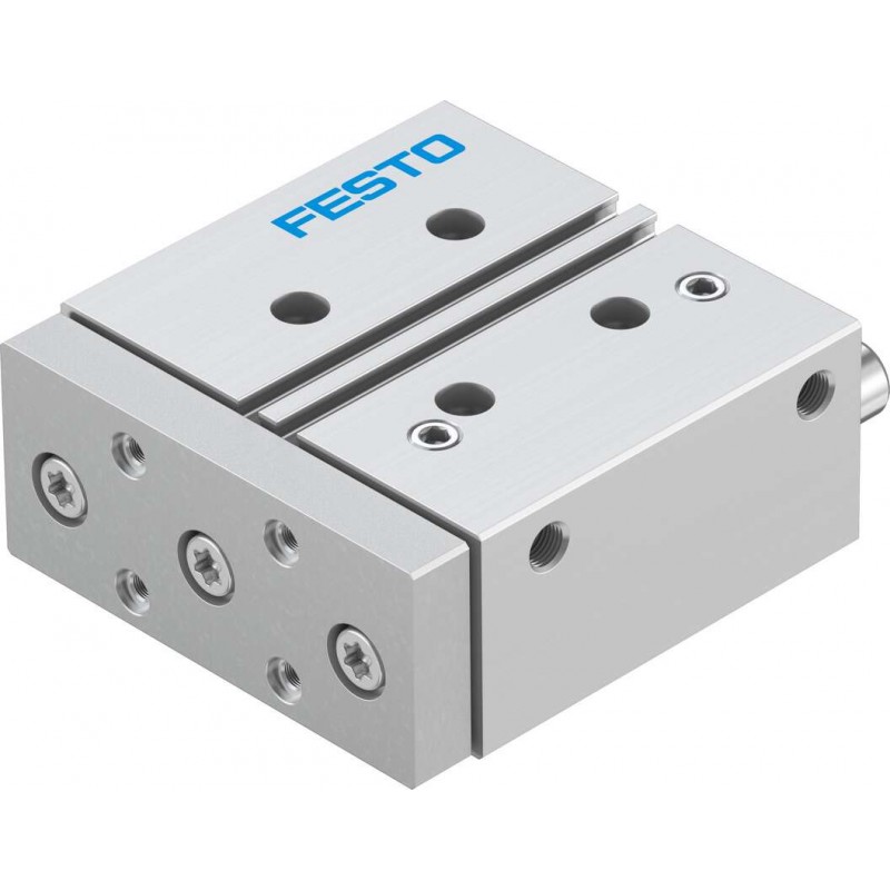 Festo DFM sorozatú kettősműködésű vezetett henger gördülőcsapággyal, dugattyú átmérő 12 mm, lökethossz 20 mm. Rugalmas csillapító gyűrűkkel mindkét végén, üzemi nyomás 2 bar ... 10 bar, pneumatikus csatlakozás M5.