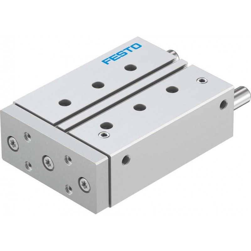 Festo DFM sorozatú kettősműködésű vezetett henger siklócsapággyal, dugattyú átmérő 50 mm, lökethossz 50 mm. Rugalmas csillapító gyűrűkkel mindkét végén, üzemi nyomás 1 bar ... 10 bar, pneumatikus csatlakozás G1/4.