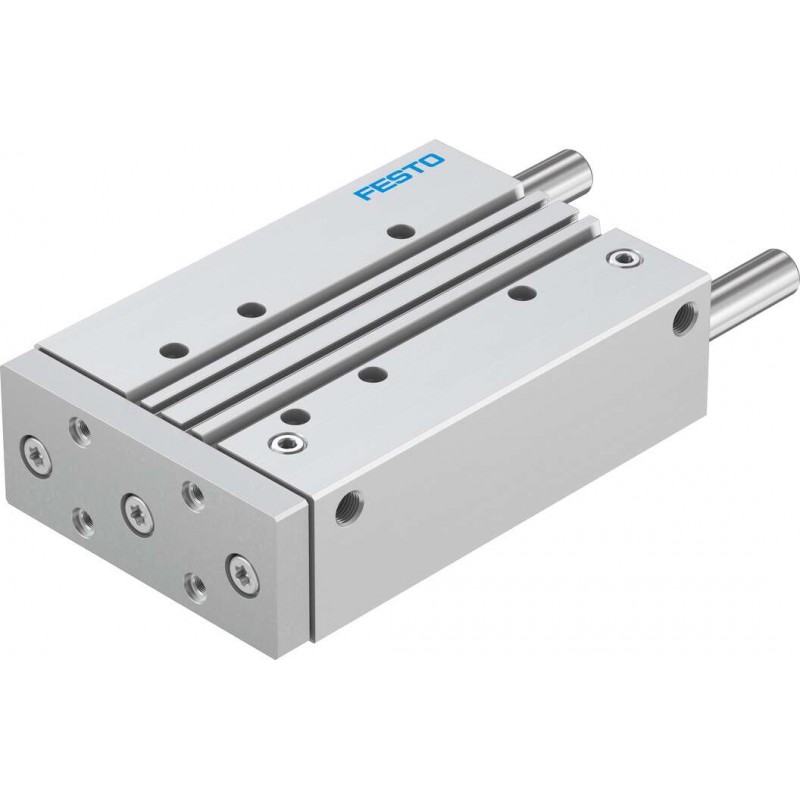 Festo DFM sorozatú kettősműködésű vezetett henger siklócsapággyal, dugattyú átmérő 63 mm, lökethossz 50 mm. Rugalmas csillapító gyűrűkkel mindkét végén, üzemi nyomás 1 bar ... 10 bar, pneumatikus csatlakozás G1/4.