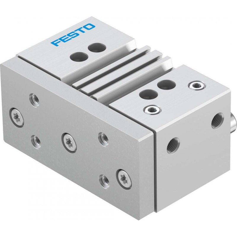 Festo DFM sorozatú kettősműködésű vezetett henger siklócsapággyal, dugattyú átmérő 40 mm, lökethossz 25 mm. Rugalmas csillapító gyűrűkkel mindkét végén, üzemi nyomás 1.5 bar ... 10 bar, pneumatikus csatlakozás G1/8.