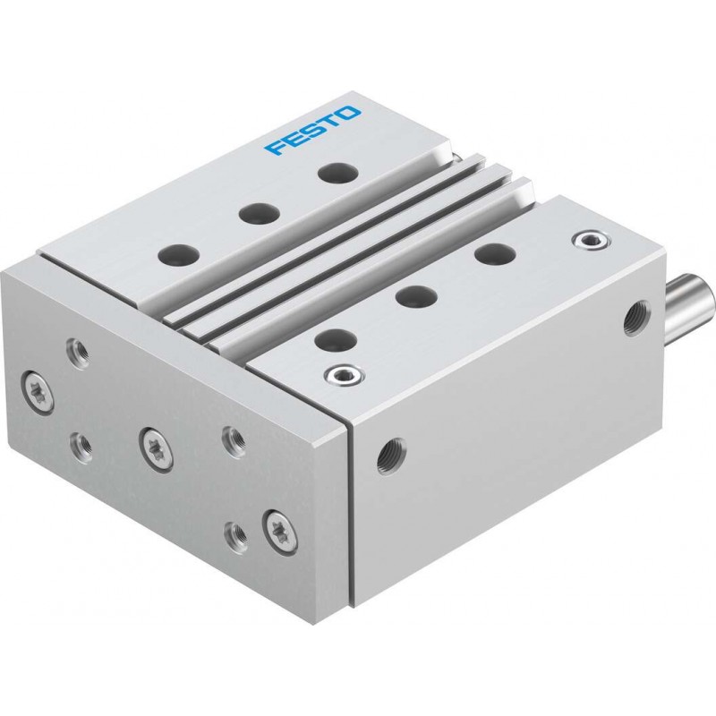 Festo DFM sorozatú kettősműködésű vezetett henger siklócsapággyal, dugattyú átmérő 50 mm, lökethossz 50 mm. Rugalmas csillapító gyűrűkkel mindkét végén, üzemi nyomás 1 bar ... 10 bar, pneumatikus csatlakozás G1/4.