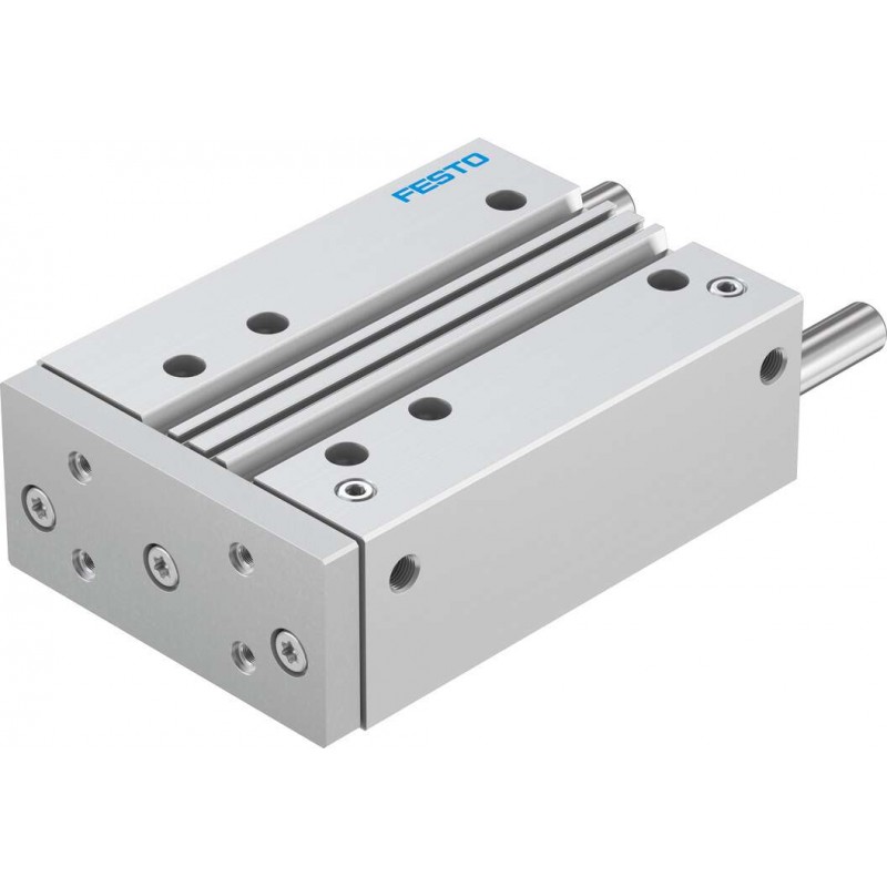 Festo DFM sorozatú kettősműködésű vezetett henger siklócsapággyal, dugattyú átmérő 32 mm, lökethossz 100 mm. Rugalmas csillapító gyűrűkkel mindkét végén, üzemi nyomás 1.5 bar ... 10 bar, pneumatikus csatlakozás G1/8.