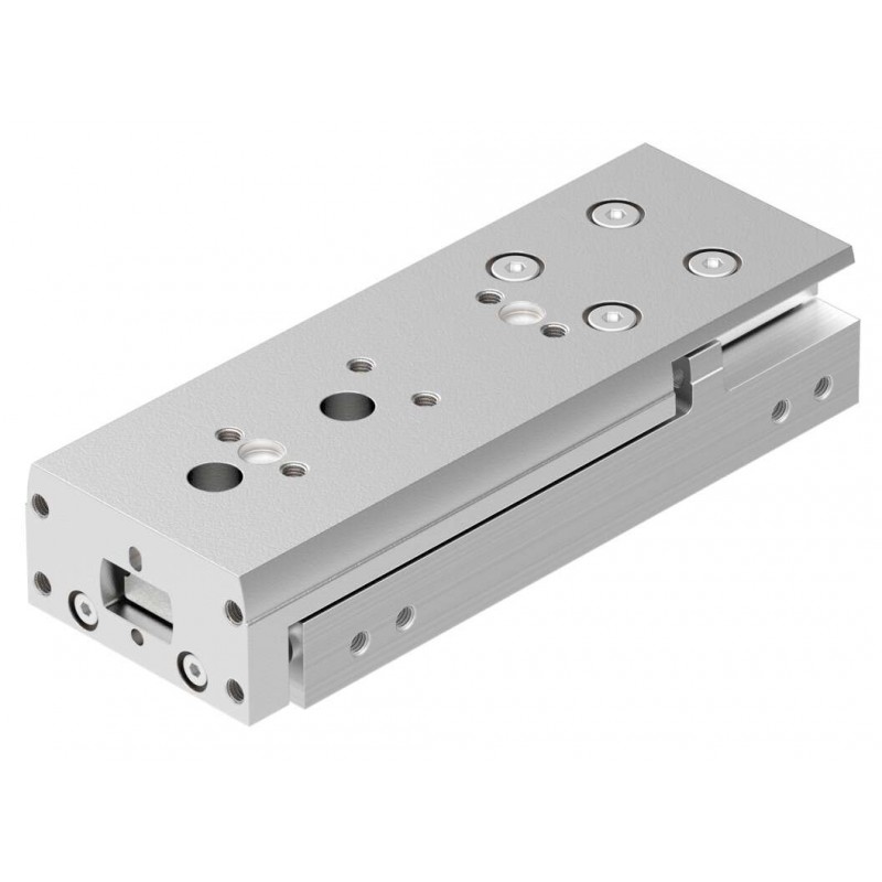 Festo DGST sorozatú kettősműködésű mini szánegység golyóscsapággyal, dugattyú átmérő 8 mm, lökethossz 40 mm. Csillapítás: elasztomer párnával mindkét végén (a löket nem állítható), üzemi nyomás 1.5 bar ... 8 bar, pneumatikus csatlakozás M5.