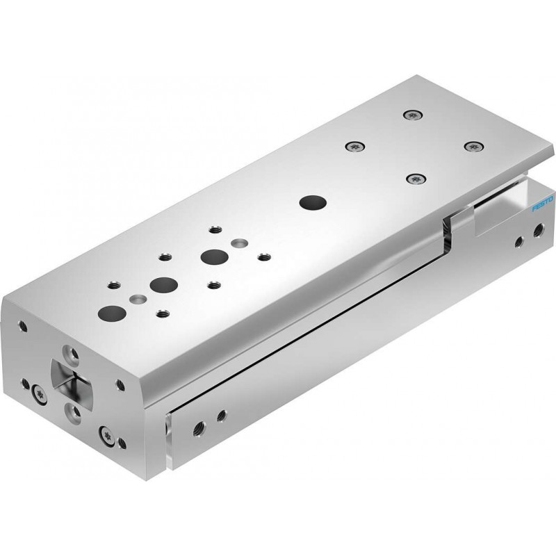 Festo DGST sorozatú kettősműködésű mini szánegység golyóscsapággyal, dugattyú átmérő 12 mm, lökethossz 100 mm. Csillapítás: elasztomer párnával mindkét végén (a löket nem állítható), üzemi nyomás 1 bar ... 8 bar, pneumatikus csatlakozás M5.